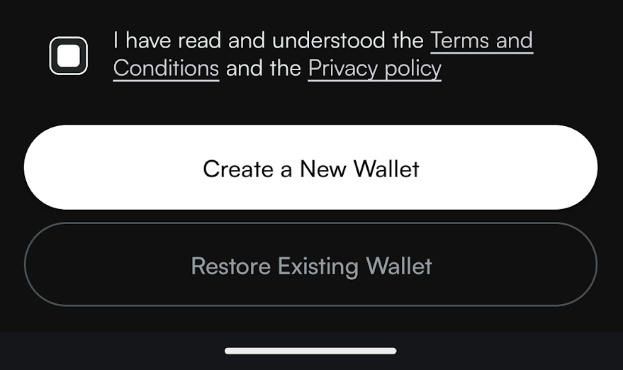 Read and accept the Terms and Conditions and Privacy Policy by checking the box. Then, tap Create a New Wallet.